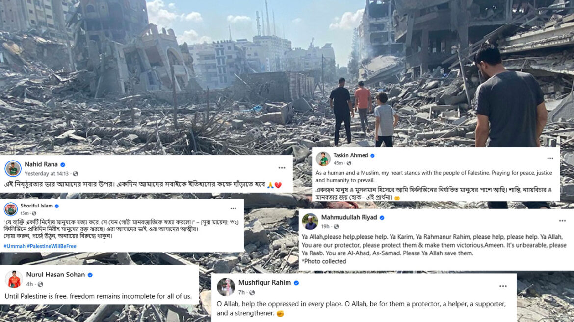 গ্রাফিকাল ছবি পোস্ট করে মাহমুদউল্লাহ আল্লাহর একাধিক গুণবাচক নাম সামনে এনে প্রার্থনা করেছেন ফিলিস্তিনের জন্য। তাদের রক্ষা এবং বিজয় অর্জনের দোয়ার বাণী ফুটে উঠেছে তার লেখায়। পেসার নাহিদ রানা একাধিক ছবি পোস্ট করে ক্যাপশনে লিখেছেন, ‘এই নিষ্ঠুরতার ভার আমাদের সবার উপর। একদিন আমাদের সবাইকে ইতিহাসের কক্ষে দাঁড়াতে হবে।’